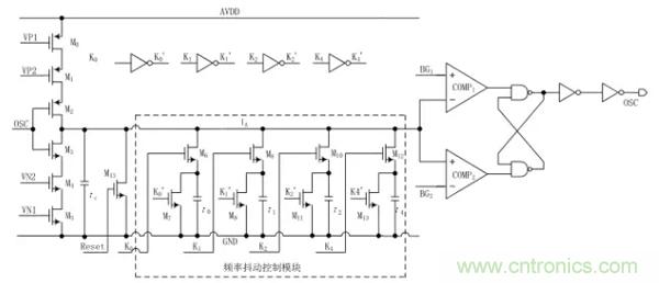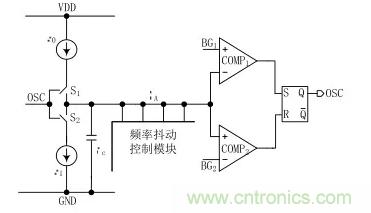 由圖1可以看出,頻率抖動(dòng)振蕩器由一個(gè)張弛振蕩器加上一個(gè)頻率抖動(dòng)模塊構(gòu)成。其工作原理:首先,開關(guān) S1閉合,電流源 I0給電容 Cc充電,充電剛開始時(shí)電容 Cc上極板的電壓小于 BG1和 BG2,RS 觸發(fā)器的輸出被置為低電平 0,當(dāng)電容上極板電壓 VA大于 BG2時(shí),RS 觸發(fā)器的輸出狀態(tài)處于保持狀態(tài),直到上極板電壓 VA大于 BG1之后 RS 觸發(fā)器的輸出翻轉(zhuǎn)被置為高電平1;此時(shí),開關(guān) S2導(dǎo)通,電流源 I1給電容Cc放電,當(dāng)VA減小到小于 BG1時(shí),RS 觸發(fā)器的輸出處于保持狀態(tài),當(dāng)VA減小到小于 BG2時(shí),RS 觸發(fā)器翻轉(zhuǎn)被置為低電平 0 ;于是,開關(guān) S1又閉合開始對 Cc充電,如此周而復(fù)始,得到一個(gè)頻率固定的振蕩器。圖1中的電流源I0、 I1的電流相等,則振蕩器的占空比為 0.5。頻率抖動(dòng)控制模塊是通過計(jì)數(shù)器來周期性的切換加入到張弛振蕩器中充放電電容的大小,改變電壓 VA的充放電速度,從而來達(dá)到周期性的改變振蕩器頻率的目的,即實(shí)現(xiàn)了振蕩器頻率的抖動(dòng)。
