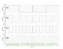 頻率抖動(dòng)模塊的輸出仿真波形如圖 5 所示,計(jì)數(shù)器 K0,K1,K2,K4實(shí)現(xiàn)了加減法交替功能,從而周期性頻率抖動(dòng)振蕩器的振蕩頻率為平穩(wěn)的完成周期性的變化。