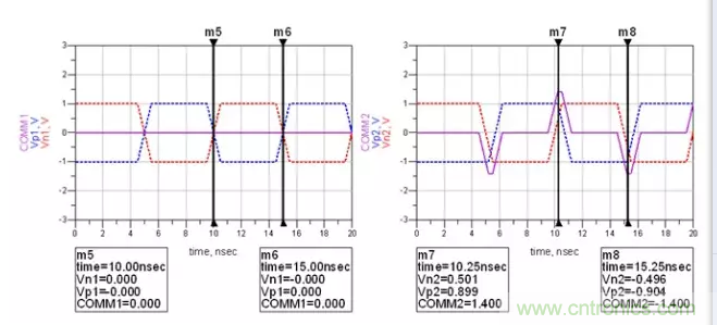 可以看到,兩次經過零軸的時間由之前的5ns變成了4.8ns。或者說,N與P的長度差,引起了0.04UI的抖動。這時候,串行的Clock recovery該花點心思才能將其時鐘解出來了。而且在進行時鐘與數據對位的時候,是對在0V這個階梯的左邊還是對在右邊呢?這又會引起時序問題的出現。