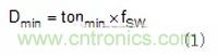 試圖在2MHz條件下工作時(shí)的第二個(gè)考慮因素是最小輸入電壓(VIN)和輸出電壓(VOUT)的轉(zhuǎn)換比。這與轉(zhuǎn)換器的最小接通時(shí)間有關(guān),因?yàn)樵摫嚷试谵D(zhuǎn)換器需要操作時(shí)設(shè)定接通時(shí)間。例如,若轉(zhuǎn)換器具有100ns的最小導(dǎo)通時(shí)間且在2MHz條件下工作,則使用公式1,其可以支持的最小轉(zhuǎn)換比(Dmin)為20%。若給定的VIN至VOUT比所需的導(dǎo)通時(shí)間小于最小導(dǎo)通時(shí)間,則多數(shù)轉(zhuǎn)換器進(jìn)入脈沖跨越模式以保持輸出電壓穩(wěn)定。當(dāng)脈沖跨越時(shí),開(kāi)關(guān)頻率發(fā)生變化且可能在需要限制噪聲的頻率中引起噪聲。