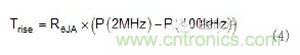 與開(kāi)關(guān)頻率相關(guān)的轉(zhuǎn)換器中的兩個(gè)主要損耗是高側(cè)MOSFET和死區(qū)時(shí)間損耗的開(kāi)關(guān)損耗。等式3是這些損失的基本估計(jì),您可用它進(jìn)一步分析伴隨較高開(kāi)關(guān)頻率損耗增加的影響。例如,若為5V輸入、4A負(fù)載、3ns上升時(shí)間、2ns下降時(shí)間、0.7V體二極管壓降和20ns死區(qū)時(shí)間,預(yù)估功率損耗在2MHz時(shí)為325mW,在400kHz時(shí)為65mW。