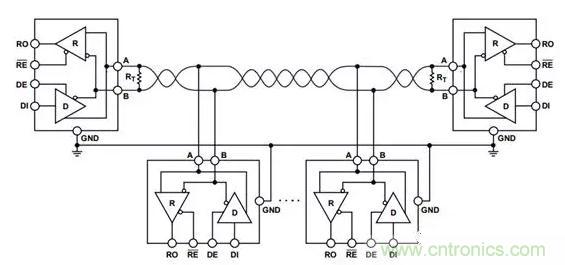 最大可以接多少個節(jié)點由RS-485接收器的輸入阻抗來決定,標(biāo)準(zhǔn)RS-485接收器輸入阻抗大于12K歐姆,最多可以驅(qū)動32個負(fù)載。輸入電阻越大,驅(qū)動的負(fù)載越多。比如ADM3061EARZ輸入阻抗48K歐姆,最多可以驅(qū)動128個負(fù)載。