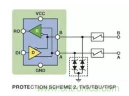 TVS管非對稱擊穿電壓:RS485芯片需要保障在+12V至–7V的收發(fā)器共模范圍。因此對于TVS管的要求也是非對稱擊穿電壓。比如CDSOT23-SM712獨有特性是具有+13.3V和–7.5V的非對稱擊穿電壓。