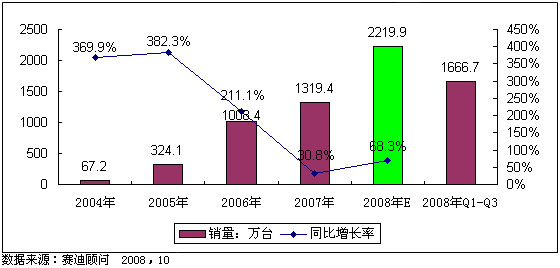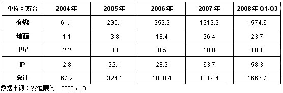 進入2008年,中國數字電視產業特別是有線數字電視產業保持了快速發展的勢頭,數字電視機頂盒市場與數字電視整體轉換同步發展,市場規模不斷增長。2008年前三季度中國機頂盒市場銷量迎來井噴,賽迪顧問的調研數據顯示,前三季度中國市場共銷售機頂盒1666.7萬臺,同比增長了83.4%。