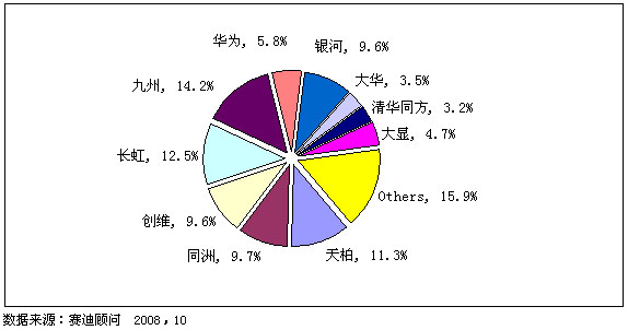 在品牌市場方面,九洲在2008年全面發力,國內國際市場雙豐收;長虹繼續有穩定的表現,以12.5%的份額位居品牌排名第二位;天柏和同洲銷量也持續增加,分別位于市場第三和第四位,銷售量市場占有率為11.3%和9.7%。值得一提的是,隨著市場銷量的暴漲,除TOP10之外,其它品牌也有了較好的表現,市場份額有了較大的提高。相比2007年,前十名企業的市場集中度出現了下滑,究其原因,主要是因為市場增長很快,主流企業的生產規模和影響力難以滿足全部新增市場的需求,不少地方性的小企業搶占市場所致。