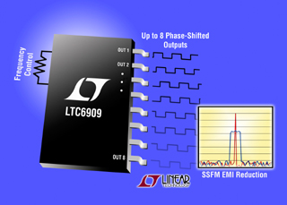 凌力爾特公司 (Linear Technology Corporation) 推出精確硅振蕩器LTC6909,該器件極大地降低了峰值輻射 EMI,并在多相電源中改善了開關穩壓器的控制。LTC6909 有 8 個獨立輸出,提供多達 8 個軌至軌 50% 占空比時鐘信號。這些輸出可以用來啟動或禁止以及實現多個開關穩壓器的相位同步。相位同步提供多種設計優勢,包括改善的 EMI 性能、降低的輸入和輸出紋波電流、以及更好的負載瞬態響應。使用 3 個邏輯輸入,這些輸出之間的相位關系可以從 45o 至 120o 配置,或者輸出可以被置于邏輯低或高 Z 狀態。