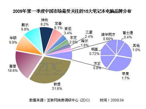 (圖) 2009年第一季度中國(guó)市場(chǎng)最受關(guān)注的15大筆記本電腦品牌分布
