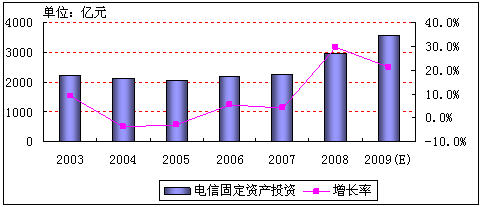 2009年伊始,3G牌照的發放預示著中國3G時代的到來。三大運營商紛紛加大3G網絡建設的投資力度,作為運營商運維設備的重要組成部分,通信測試市場有望迎來快速增長。圖1顯示,2004-2005兩年電信投資基本維持原有水平,2006-2007年期間投資力度出現小幅增長。2008年電信固定資產投資總額近3000億元,較2007年有大幅提升。2009年由于3G的啟動,電信投資有望進一步加大力度。可以預計未來兩到三年,中國電信固定資產投資將進入高速增長期。