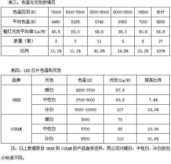 眾所周知,LED路燈的光效與色溫密切相關。從表四可看出,GREE芯片不同色溫的光效差別不大,但OSRAM芯片則不然,不同色溫的光效差別較大,6500K芯片比5700K芯片光效提高31.8%。因此,LED路燈必須在色溫與光效之間取得平衡,既要充分考慮市民的舒適感和滿意度,也不能為追求低色溫而大幅犧牲光效。畢竟,照度和功率密度值是《城市道路照明設計標準》(CJJ45-2006)的硬指標,必須有較高光效才能滿足要求。同時,由于不同色溫芯片的價格差別較大,成本因素也需要認真考慮。
