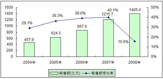 2008年,中國汽車電子市場繼續(xù)保持較快的增長態(tài)勢,但在汽車產(chǎn)量增速急劇回落的影響下,市場發(fā)展速度有所回落,成為2000年以來的一個低谷。全年汽車電子產(chǎn)品銷售額達到1405.4億元,比2007年同期增長15.6%。