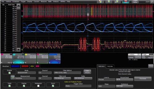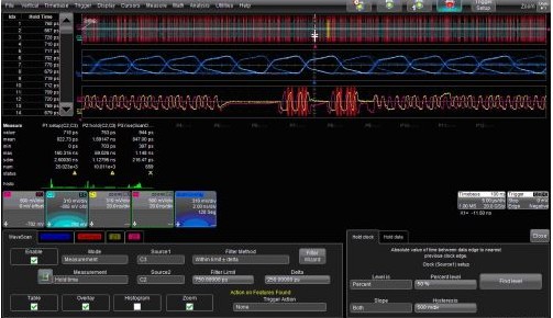力科的WaveScan波形搜索與掃描特性可以通過(guò)選擇Strobe和掃描疊加(ScanOverlay)圖中滿足條件的波形之間的時(shí)序關(guān)系找出Data信號(hào)。圖2是這種功能的一個(gè)例子。WaveScan的對(duì)話框設(shè)置為搜索建立時(shí)間(Hold Time)在500ps到1ns(750 ±250 ps)之間的波形。對(duì)話框右邊的標(biāo)簽用來(lái)鑒別Strobe和Data信號(hào)。注意“Hold Clock”和“Hold Data”兩個(gè)對(duì)話框標(biāo)簽,測(cè)量是對(duì)這兩個(gè)信號(hào)邊沿設(shè)定的。
