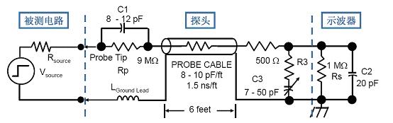 圖3給出了電阻分壓的探頭等效電路,Rp和Rs構成了一個10:1的分壓器,Rs為示波器的輸入阻抗。調節補償電容C3使得探頭和示波器通道RC乘積相匹配,這樣就能保證在探頭的尖端獲得正確的頻率響應曲線,并且這種探頭的頻率響應比1:1探頭頻率響應要寬得多。
