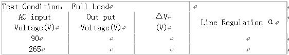 (1)交流輸入電壓90V,160V,220V,265V,輸出電流為100%Io,30%Io,空載時,測出對應(yīng)的穩(wěn)定的直流輸出電壓值Uo與對應(yīng)的交流輸入功率Pin。