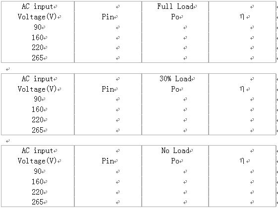 1.內(nèi)容:測試不同交流輸入電壓,不同負(fù)載條件下電源效率η