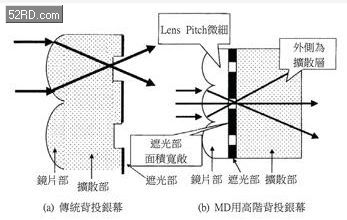 事實(shí)上早期的MD方式RP-TV都是使用CRT背投電視螢?zāi)唬虼耸冀K無法充分發(fā)揮MD方式RP-TV的特性,有監(jiān)于此日本凸版印刷公司首度開發(fā)如(圖五)所示MD方式RP-TV專用螢?zāi)?,由圖可知MD方式RP-TV專用螢?zāi)坏腖enticularLens與遮光部各自獨(dú)立設(shè)置,尤其是遮光部設(shè)于擴(kuò)散部后面革命性設(shè)計(jì),使得該MD方式RP-TV專用螢?zāi)豢梢跃邆錁O佳的光學(xué)特性。