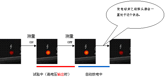 這個探棒前端的小按鈕跟主機上面的“MEASURE(測量)”按鈕一樣,只是單純的控制電壓輸出的嗎?其實不然。仔細看會發現,在電壓輸出的時候,紅色的指示燈會亮。那也就是說,這個按鈕是與主機上面的閃電標識(請看上面提到過的“自動放電功能”的說明)連動的。也就是說,有以下兩個作用: