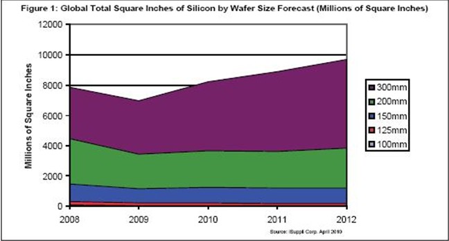 iSuppli公司預測,2013年300毫米晶圓產量將從2008年的36億平方英寸增長到61億平方英寸,復合年度增長率(CAGR)為12.4%。相比之下,200毫米晶圓將從2008年的30億平方英寸下降到27億平方英寸,復合年度增長率為負2%。