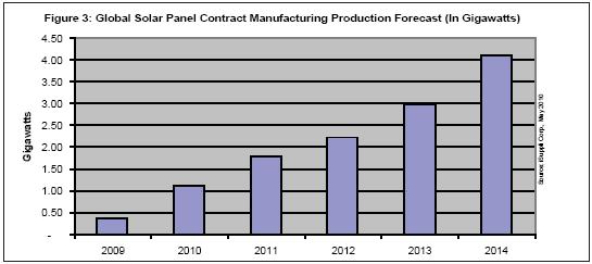 2010年合同制造商將生產(chǎn)1.1GW的太陽能電池板,比2009年時的369MW大增200%。其余的生產(chǎn)任務(wù)將由專門的太陽能電池板廠商以及其它企業(yè)承擔。2014年合同制造商生產(chǎn)的太陽能電池板將比2010年增長近三倍,達到4.1GW。
