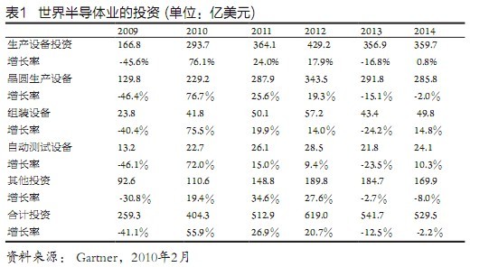 近期半導體業(yè)的迅猛增長,推動了半導體生產(chǎn)設(shè)備市場的快速復蘇,存儲器、代工業(yè)的發(fā)展以及進一步走向微細化先進技術(shù)的要求,則是主要的拉動力量。在各項生產(chǎn)設(shè)備中晶圓生產(chǎn)線(wafer fab)設(shè)備最為重要,增長也最快,2010年將竄升76.7%,達229億美元,獨占半導體生產(chǎn)設(shè)備的78%,整個半導體業(yè)投資的近57%。組裝設(shè)備增長75.5%,達41.8億美元,自動測試設(shè)備增長72%,達22.7億美元。其他有關(guān)投資增長19.4%,達110.6億美元,整個半導體業(yè)投資共增長55.9%,達到404.3億美元(表l)。