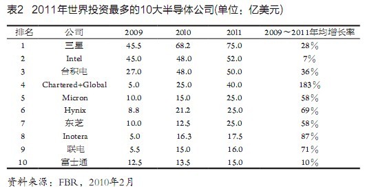又據(jù)FBR市場調(diào)研公司發(fā)表的報告,世界半導體業(yè)的總投資額2009~2011年分別為257億美元、406億美元和495億美元,和Gartner公司所報基本相同。該公司又稱,這3年世界最大25家半導體公司的投資,占到整個半導體業(yè)投資的近90%。2009~2011年世界投資最多的l0家半導體公司如表2所示。