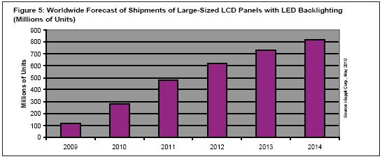 圖5所示為2009-2014年全球用于大尺寸液晶面板的LED背光出貨量預(yù)測。