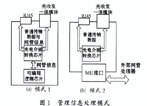 收發器網管功能的實現有兩種方式:一種是在收發器電路板上配置網絡管理信息處理器——可編程邏輯芯片來處理網管信息,該芯片利用OEMC上的雙向管理指令接口(Managenent Data Input/Output,MDIO)、管理數據同步時鐘輸入接口(ManagenentData Clock,MDC)及被管理信息輸入/輸出管腳等接口來獲取管理信息,管理信息與網路上的普通數據共用數據通道,如圖1(a)所示。第二種方式如圖1(b)所示,收發器上沒有管理信息處理器,收發器外部的網絡管理者通過MII接口獲取管理信息??梢姡芯W管功能的收發器,其元器件種類及數量遠遠多于無網管收發器,相應地,其布線復雜,開發周期長。