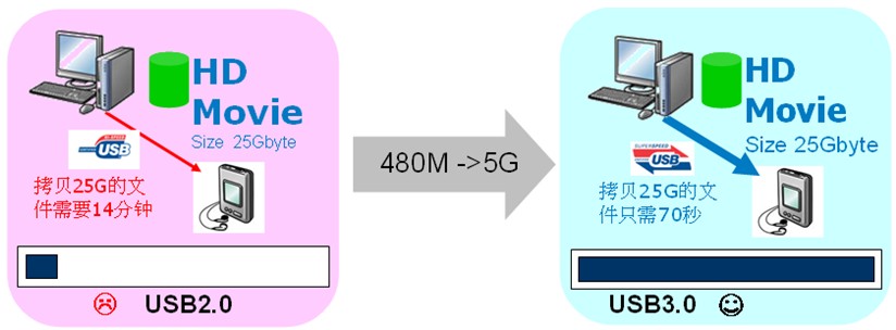 盡管USB2.0的速度已經相當快,對于目前高清視頻和TB級別的數據傳輸還是有些慢,在2008年11月,HP、Intel、微軟、NEC、ST-NXP、TI聯合起來正式發布了USB3.0的V1.0規范。USB3.0又稱為Super Speed USB,比特率高達5Gbps,相比目前USB2.0的480Mbps的速率,提高了10倍以上,引用Intel專家Jeff Ravencraft的話:“以25GB的文件傳輸為例,USB2.0需要14分鐘,而3.0只需70秒左右(如圖1所示)。”25GB,正好是單面單層藍光光盤的容量。USB3.0預計將在2011年逐漸在計算機和消費電子產品上使用。
