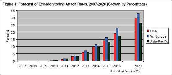 上述每類應(yīng)用的汽車配售率預(yù)計(jì)都會(huì)增長,2010-2013年增長比較緩慢,隨后從2014年開始基本以兩位數(shù)的速度增長,直到2020年末。iSuppli公司的圖表顯示,節(jié)能監(jiān)測和節(jié)能建議近期將大幅增長,而由于復(fù)雜性和需要與其它汽車系統(tǒng)整合,節(jié)能動(dòng)力總成的布署比較緩慢。但到2020年,美國和西歐的節(jié)能動(dòng)力總成應(yīng)用將達(dá)到35%的配售率,接近節(jié)能監(jiān)測和節(jié)能建議系統(tǒng)的水平。