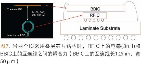 圖7給出了BBIC和RFIC采用SiP(為簡單起見,實例中未表示SMD元件)疊層芯片結構的實例。在這個實例中未使用金屬屏蔽層,使用環氧芯片粘接材料把BBIC直接堆疊在RFIC上。就像前文提到的那樣,BBIC中的主時鐘信號(20.0MHz或40.0MHz)包含一些高頻成分,落在RF芯片通帶的范圍內。如果BBIC中時鐘互連線和RF芯片之間沒有保持足夠的隔離,特別是在VCO電感中,主時鐘信號可能使RF電路產生噪聲,降低RF芯片的選擇性。