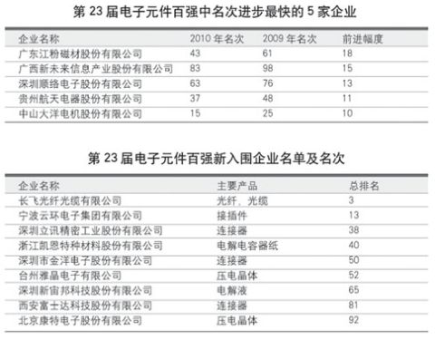 國際金融危機(jī)造成的企業(yè)經(jīng)營上的波動反饋到了第22屆、23屆元件百強(qiáng)的榜單上。在近兩屆的榜單之中,均有20家左右企業(yè)的名次出現(xiàn)了10位以上(含10位)的較大波動,去年23家,今年20家。據(jù)估計(jì),如果國際國內(nèi)的經(jīng)濟(jì)形勢能保持穩(wěn)定,在未來一兩年內(nèi),元件百強(qiáng)榜單中,名次出現(xiàn)大起大落的企業(yè)數(shù)量將會減少。