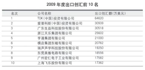 對于中國電子元件行業(yè)的外貿(mào)出口來說,2009年是一個(gè)從谷底緩慢爬升的過程。本屆元件百強(qiáng)中出口創(chuàng)匯總額為52.48億美元,同比下降10.38%,占銷售收入總額的28.81%,與上屆元件百強(qiáng)的出口總額相比,下降了9.83%。由于國際金融危機(jī)導(dǎo)致了外需萎縮,而且我國刺激內(nèi)需的各項(xiàng)政策效果明顯,一些元件百強(qiáng)企業(yè)開始更多地關(guān)注國內(nèi)市場,所以本屆元件百強(qiáng)的出口創(chuàng)匯額雖然下滑,但整體銷售收入仍然獲得增長。