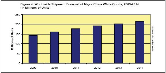 冰箱、空調和洗衣機的出貨量2010年將達到1.615億臺,比去年的1.434億增長12.6%。這些產品是中國白色家電市場的關鍵組成部分。“白色家電”源于最初這類產品都是白色外觀,但現在也采用其它顏色。iSuppli公司追蹤的其它中國白色家電包括微波爐和電磁爐。