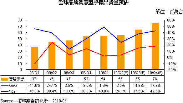 受到新興市場換機潮與新用戶的加入,以及成熟歐美市場新規格、新應用的持續推出等因素激勵,拓墣產業研究所預估2010年全球品牌手機出貨量可望達13.29億支,較2009年成長11.7%,2010下半年出貨表現將優于上半年,通訊產業研究中心謝雨珊副理分析,在智慧型手機快速低價化、iPhone 4上市之下,促使品牌廠相繼推出新款智慧型手機搶市,預估2010年全球智慧型手機出貨量為2.51億支,年成長率達37.9%,連續三年以超過30%以上高成長率攻占市場,2011年全球智慧型手機出貨量更挑戰4億支關卡,滲透率將從2010年的18.9%,攀升至2011年的27.6%,屆時每四款手機中即有一款是智慧型手機。