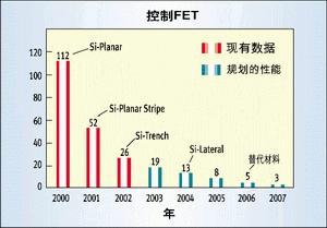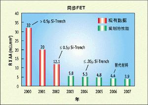 圖2所示的是同步或稱低端(low-side)FET的品質因數。在這里,實際上是傳導損耗主宰了處在導通電阻時域的品質因數。僅在過去的兩年中,通過將1至2微米溝道技術升級為深亞微米水平,就使品質因數提高了約3倍,今后還有更多的改進余地。
