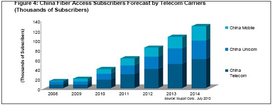 圖4所示國iSuppli公司對于2008-2014年各家運(yùn)營商的光纖接入用戶數(shù)量預(yù)測。