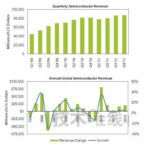iSuppli從正面否定了對于此次快速增長所擔心的“泡沫”和“二次探底”。關于泡沫問題,有觀點認為,此前曾創下歷史最高增長率的2000年出現了需求泡沫,所以此次的增長會不會也是泡沫。但是,iSuppli指出,2000年的增長是繼1999年經濟繁榮之后的產物,而此次增長的背景卻是經濟形勢從2009年以前的經濟低迷期開始的復蘇,因此這兩種情況“在循環本質上完全不同”。關于二次探底,iSuppli高級副總裁戴利·福特(Dale Ford)表示,“我不同意二次探底將要到來的觀點”。他認為,從2010年下半年開始,2010年半導體市場將恢復到通常模式。也就是說,2010年第二季度將環比增加8.2%,達到峰值,第三季度將環比增加6.7%、第四季度將環比增加0.4%,出現減速,進入2011年后,由于通常的季節因素,將轉為環比負增長。iSuppli預測,回到這種標準增長模式后,2011年的半導體市場將增長7%。