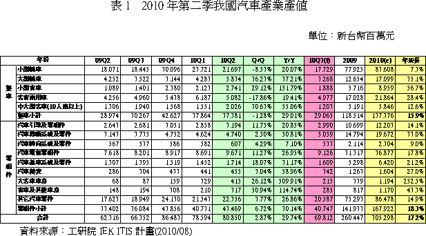 2010年第二季汽車產(chǎn)業(yè)總產(chǎn)值預估為新臺幣808.5億元,較上一季成長2.87%,較2009年同期成長29.74%(表1)。