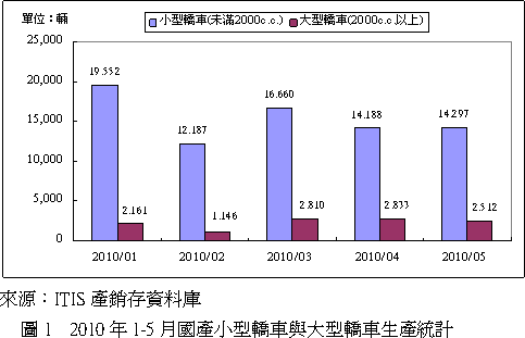 觀察1-5月國產(chǎn)小型轎車與大型轎車生產(chǎn)情形(圖1),小型轎車1月份的產(chǎn)量遠高于其他月份,乃部分產(chǎn)量對應2009年貨物稅減徵期間尚未消化的訂單,另外2月份較少的生產(chǎn)日數(shù)造成整車產(chǎn)量為各月中最低者,特別是大型轎車的部分。 相較于2010年第一季,預估第二季整車總產(chǎn)值衰退1.28%,小型轎車產(chǎn)值衰退8.5%,而大型轎車產(chǎn)值則有36.2%的成長。