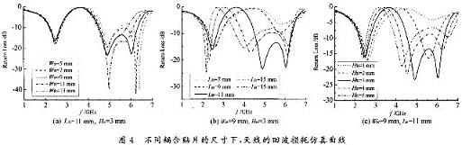圖4(a)顯示了耦合貼片的寬度(WB)分別取5mm,7mm,9mm,11mm和13mm時,天線的回波損耗仿真曲線。耦合貼片的寬度對天線諧振性能的影響主要集中在高頻段。隨著耦合貼片寬度的增加,由耦合貼片產生的諧振模式匹配特性變好,同時本征高次模式向低頻移動并逐漸消失。