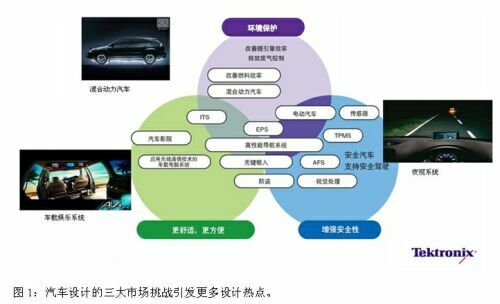 然而,面對日益復雜的汽車設計需求,特別是要推出中高端和商用的新能源汽車之時,自主創新和開發之路并非坦途。泰克科技的專家曾在不久前舉辦的一場汽車電子技術論壇上以擁有“100多個ECU、軟件代碼已經達到700萬行”的豐田Lexus460汽車為例,強調了電子部件在汽車特別是高端汽車中所占據的比例越來越高。“如圖1,汽車電子關乎目前汽車設計的三大市場挑戰,即如何滿足生態(環境保護)、更舒適方便和增強安全性的要求,而圍繞解決這些挑戰的系統和子系統正是目前汽車電子設計的熱點和難點。”他指出。“而局域網、動力系統、電子控制單元和數字RFID的應用在改善汽車生態學、安全性和舒適性方面扮演了重要的角色。
