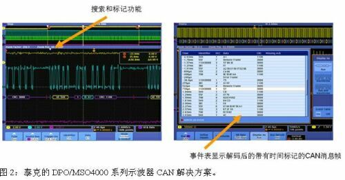 對于汽車中常用的CAN、LIN這類低速串行總線的調試,泰克的DPO/MSO4000系列示波器提供了簡單、易用、完整、高品質的觸發、捕獲和解碼解決方案。如圖2,該示波器系列提供了搜索和標記功能,可在事件表顯示解碼后的帶有時間標記的CAN消息幀,這一功能是其他競爭性產品所不具備的。