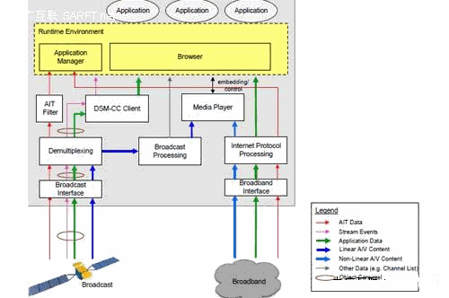 通過寬帶通道(BroadbandInterface),雙模終端能夠連接到互聯(lián)網(wǎng)或其它的IP網(wǎng)絡(luò)。它提供了應(yīng)用數(shù)據(jù)接收的第二個通道,以便與應(yīng)用提供商的服務(wù)器連接。這個連接用于接收非線性音視頻內(nèi)容(如內(nèi)容點播業(yè)務(wù))。互聯(lián)網(wǎng)協(xié)議處理器(InternetProtocolProcessing)組件包含了處理來源于互聯(lián)網(wǎng)等IP網(wǎng)絡(luò)數(shù)據(jù)的功能,通過這個組件,應(yīng)用數(shù)據(jù)提供給運行環(huán)境,非線性音視頻內(nèi)容傳送到媒體播放器(MediaPlayer),包含在應(yīng)用中解析、呈現(xiàn)與播放。
