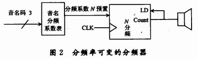 因此若采用模值和輸入脈沖頻率都可控的計數器實現信號分頻,可根據音程碼選擇分頻計數器的輸入脈沖頻率fs、根據音名碼控制分頻計數器的模值N,如圖2所示。