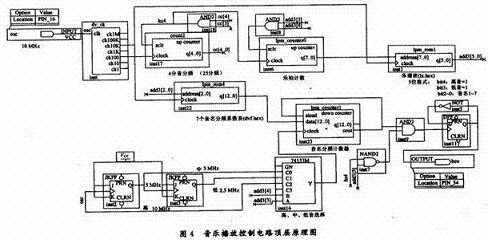 根據設計電路原理框圖,曲譜碼以分頻數編碼,音高信號分頻由一個可預置的模N計數器實現。分頻系數表和曲譜表都存儲在ROM中。若希望控制蜂鳴器的信號占空比為50%,分頻器的輸出信號采用二分頻電路實現占空比整形,但注意信號頻率被降低一半。電路原理框圖中M分頻器的作用是產生合適的時值計數脈沖頻率。電路的頂層原理圖如圖4所示。