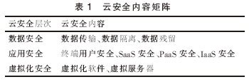 云安全架構的一個關鍵特點是云服務提供商所在的等級越低,云服務用戶自己所要承擔的安全能力和管理職責就越多。下面對云計算安全領域中的數據安全、應用安全和虛擬化安全等問題(見表1)的應對策略和技術進行重點闡述。