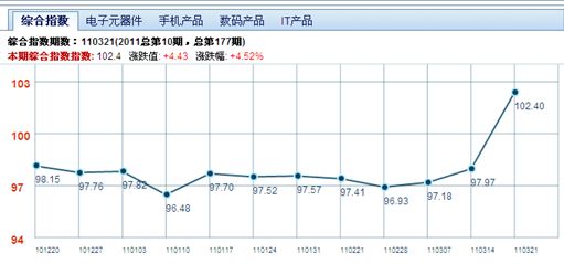 需要特別指出的是,四大成分指數之一的電子元器件指數的漲幅最為明顯,本期指數從3月14日的102.47點,漲到了110.53點,漲幅為7.87%,也是3年來之最。看來,日本地震對華強北指數的影響也是達到了峰值,也充分說明,華強北電子元器件市場已經受到了日本地震的強烈沖擊。
