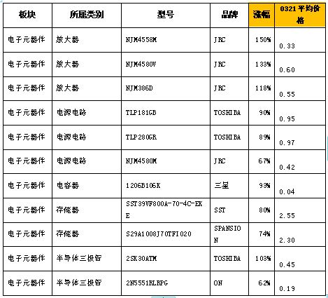 從我們采集到的數據來看,閃存開始呈現明顯上漲趨勢。3月15日,東芝閃存報價已經上漲50%,而三星、現代也提價6%-26%;從通用元器件來說,日系的產品已經全線上揚,而且是全面缺貨。下表為3月21日的電子元器件漲幅排行表,可以看出,漲幅最大的幾乎都是受災企業的產品。
