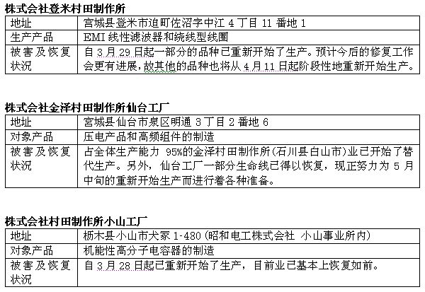 在之前,本網(wǎng)站曾報(bào)道過,截至23日18時(shí),日本東部大地震對日本村田制作所位于宮城縣和櫪木縣的三個(gè)受災(zāi)工廠的破壞程度。今天日本村田制作所再次發(fā)表聲明,告知三個(gè)受災(zāi)工廠的恢復(fù)程度。