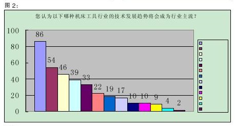 調查顯示,在回答“您認為以下哪種機床工具行業的技術發展趨勢會成為行業主流”的問題時,受訪者將智能化(24.5%)、精密化(15.4%)和高速加工(13.1%)排在前三位(詳見圖2)。其中,智能化最受被訪者關注。在本屆展會上,國內機床企業展出了眾多智能化的機床產品。例如,沈陽機床的vmc25100U立式加工中心作為智能化的代表,具有自適應控制功能,能夠運用內部專家系統進行分析處理,實時確定最佳的進給速率。