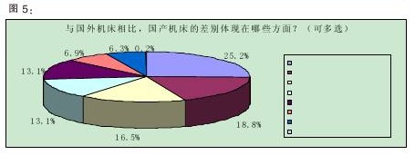 據中國機床工具工業協會統計,2010年我國機床工具產品進口總額為157.2億美元,同比增長62.0%,國內機床進口額與歷史最高的2008年同期相比還增長了27.8%,創歷史新高。進口的增長迅猛表明國內機床與國外機床的差距依然很大。本次調查報告顯示,中外機床的差距主要體現在三個方面:加工精度(25.2%)、可靠性(18.8%)、機床內部電、氣、控等配置(16.5%)。緊跟其后的是加工速度和外形方面的色彩、精美程度等,均占13.1%(詳見圖5)。由此可見,技術尤其是對精準度和可靠度是國外機床領先國內機床的優勢來源。另外,對外形的關注也是近年來客戶在使用方面出現的一種新口味。
